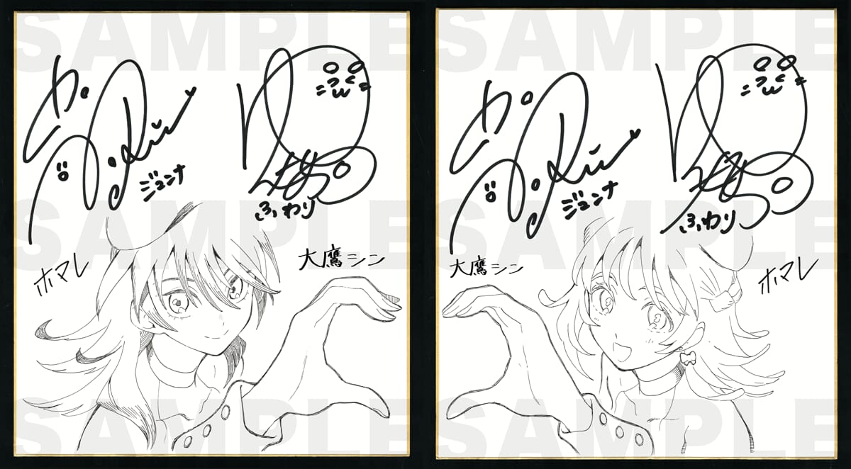 色紙にはCVを担当してくださった、高橋李依さん、伊駒ゆりえさんのサインに加え、ホマレ先生描き下ろしイラストと大鷹シン先生ホマレ先生のサインが入った超豪華色紙が当たります・