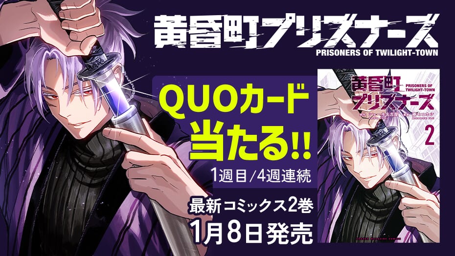 マガジンポケットにて好評連載中の『黄昏町プリズナーズ』2巻の発売を記念して、4週連続でオリジナルQUOカードが当たるキャンペーンを実施します!